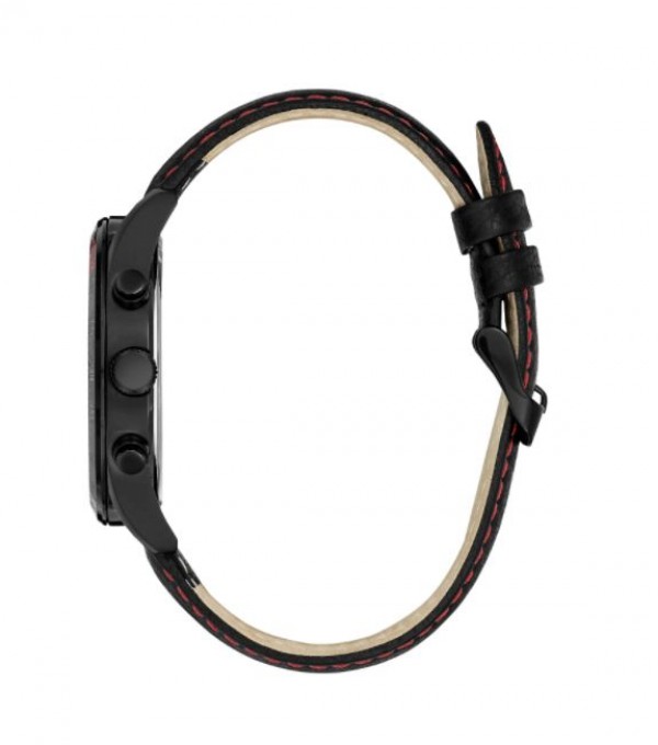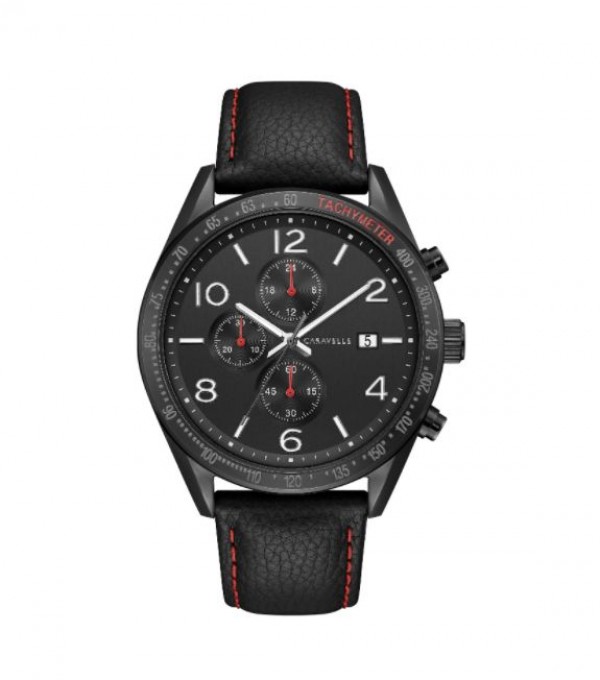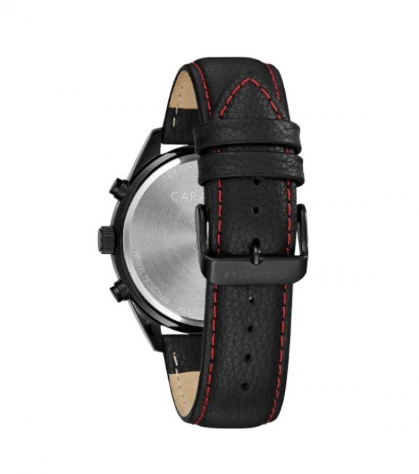 Designed by Bulova. Built for style and function. Six-hand chronograph with date feature on red-accented black dial. Midnight black IP stainless steel case and durable black leather strap with buckle closure. * Case Diameter: 44mm * Case Thickness: 10.5mm * Water Resistance: 50M * 3-Year Limited Warranty