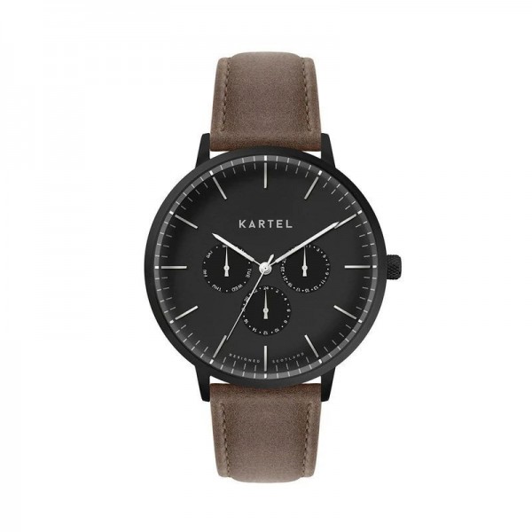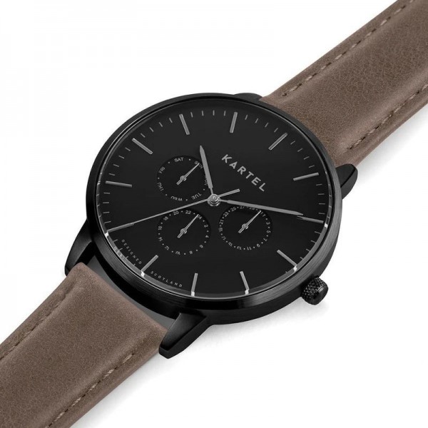 The new Cuillin calendar watch is a premium addition to the Kartel range. A large 43mm black stainless steel case features a black dial with 3 two-layer sub dials tracking the day, date and 24 hour position, beneath toughened low profile mineral glass.
