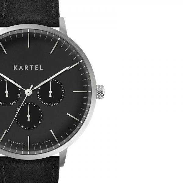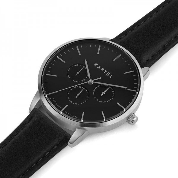 The new Cuillin calendar watch is a premium addition to the Kartel range. A large 43mm case features a black dial with 3 two-layer sub dials tracking the day, date and 24 hour position, beneath toughened low profile mineral glass.