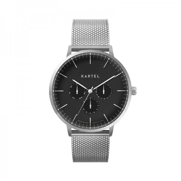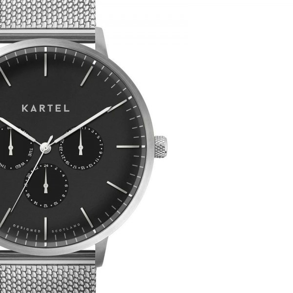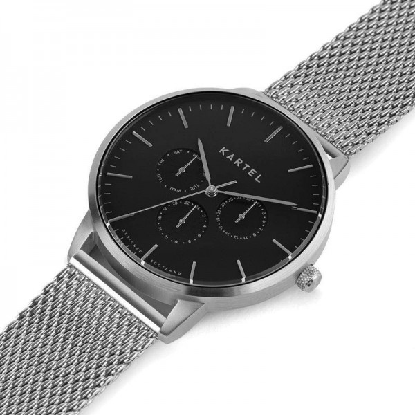 The new Cuillin calendar watch is a premium edition to the Kartel range. A large 43mm stainless steel case features a black dial with 3 two-layer sub dials tracking the day, date and 24 hour position, beneath toughened low profile mineral glass.