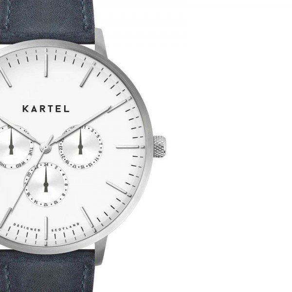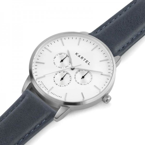 The new Cuillin calendar watch is a premium edition to the Kartel range. A large 43mm stainless steel case features a white dial with 3 two-layer sub dials tracking the day, date and 24 hour position, beneath toughened low profile mineral glass.