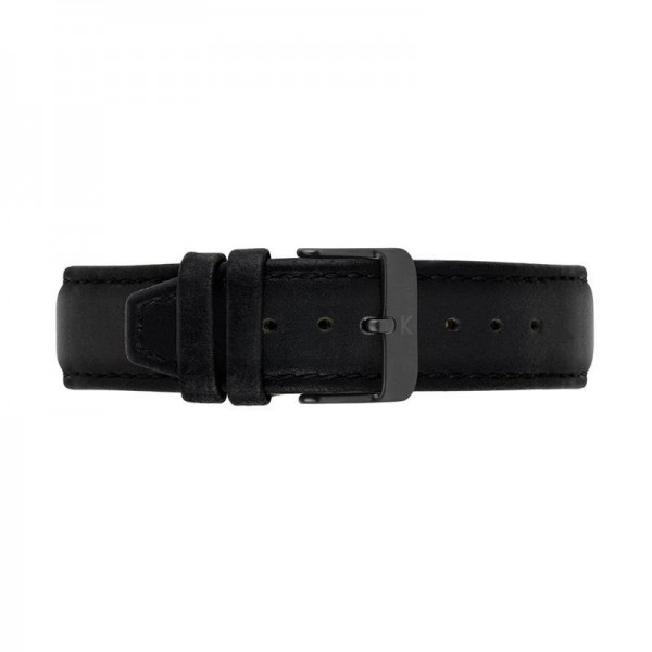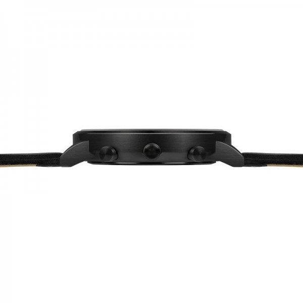 This model features our best-selling all-black colour scheme with a black case and dial featuring luminous hour and minute hands and an orange second hand, on a black stitched leather strap. The dial features dual sub-dials, displaying seconds and minutes with contrasting orange hands, and a simple date window showing the date.