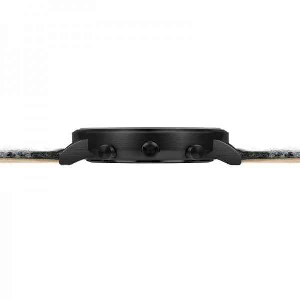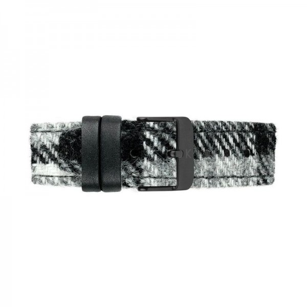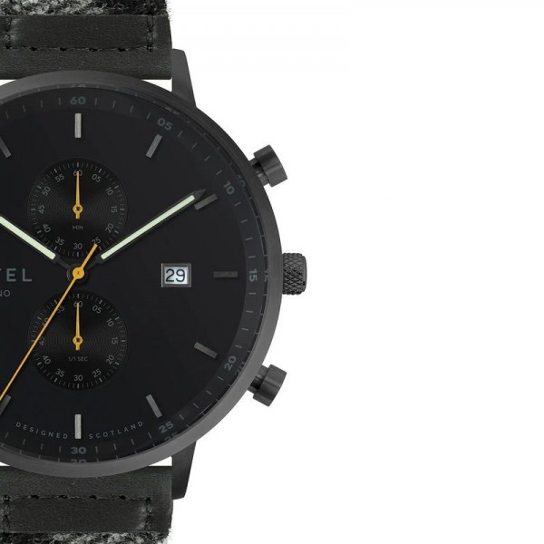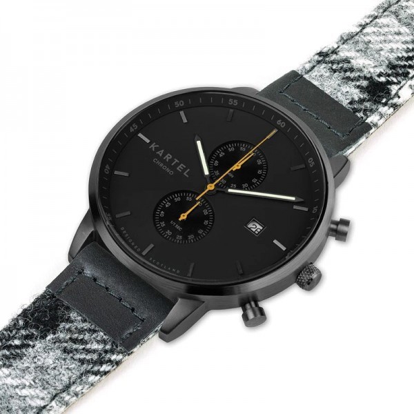 This model features our best-selling all-black colour scheme with a black case and dial featuring luminous hour and minute hands and an orange second hand, on a black & grey tartan design lambswool strap. The dial features dual sub-dials, displaying seconds and minutes with contrasting orange hands, and a simple date window showing the date.