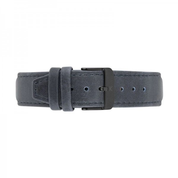 This model features our best-selling all-black colour scheme with a black case and dial featuring luminous hour and minute hands and an orange second hand, on a navy blue stitched leather strap. The dial features dual sub-dials, displaying seconds and minutes with contrasting orange hands, and a simple date window showing the date.
