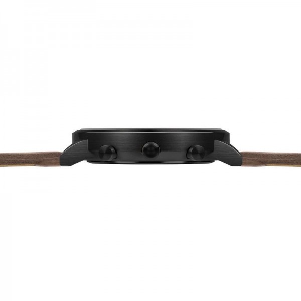 This model features our best-selling all-black colour scheme with a black case and dial featuring luminous hour and minute hands and an orange second hand, on a brown stitched leather strap. The dial features dual sub-dials, displaying seconds and minutes with contrasting orange hands, and a simple date window showing the date.