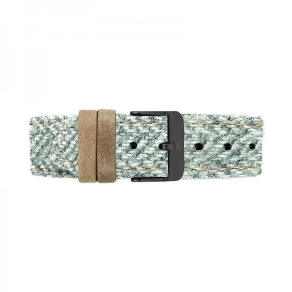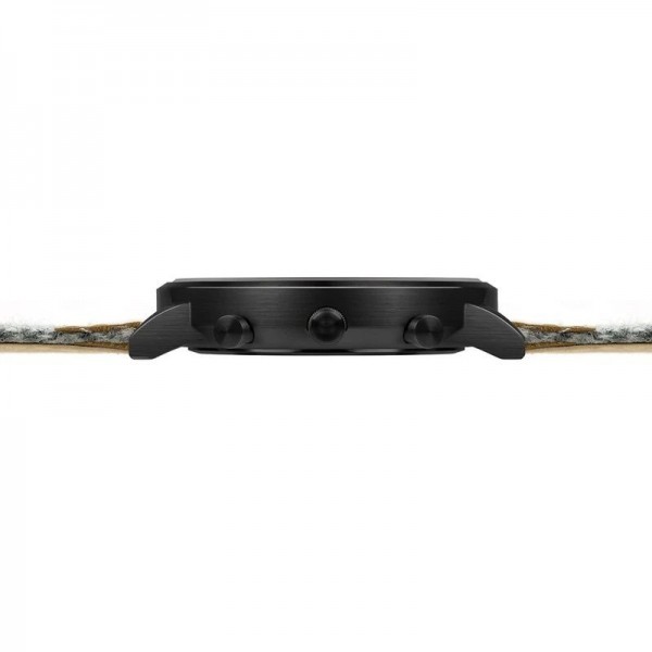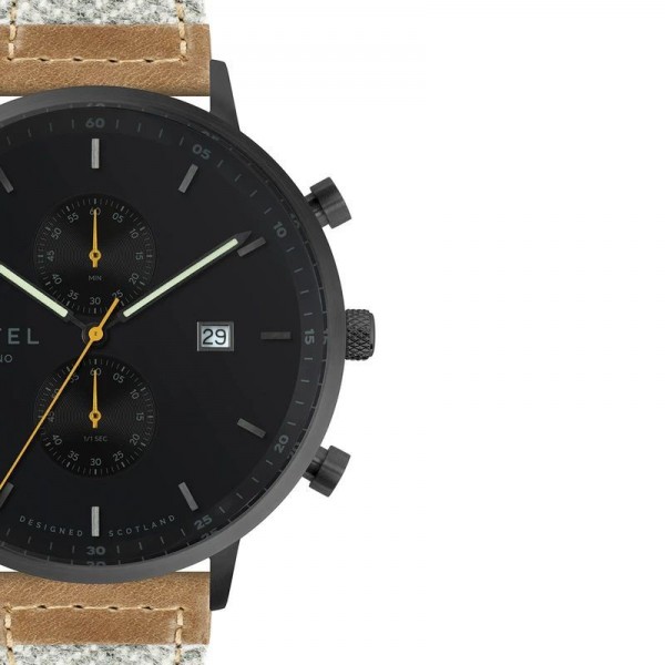 This model features our best-selling all-black colour scheme with a black case and dial featuring luminous hour and minute hands and an orange second hand, on a pale grey herringbone pattern lambswool strap. The dial features dual sub-dials, displaying seconds and minutes with contrasting orange hands, and a simple date window showing the date.
