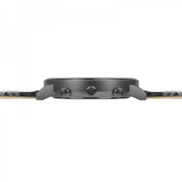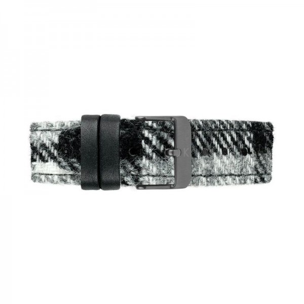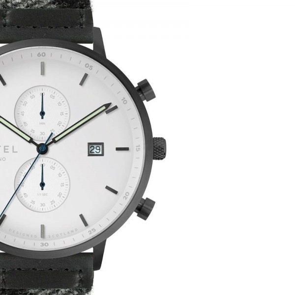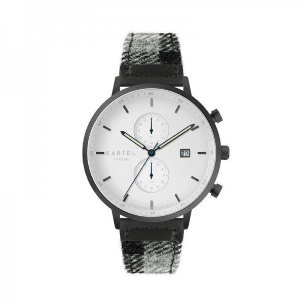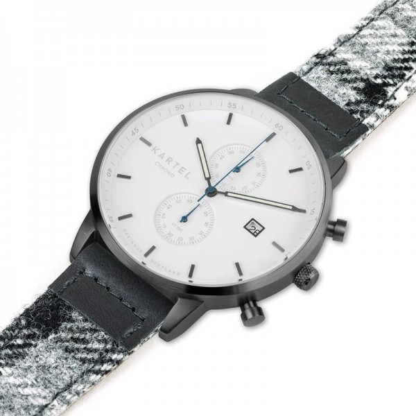 This model features a gunmetal case and white dial featuring luminous hour and minute hands and pale blue second hand, on a black & grey tartan pattern lambswool strap. The dial features dual sub-dials, displaying seconds and minutes, and a simple date window showing the date.