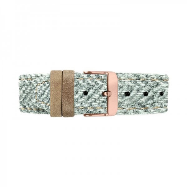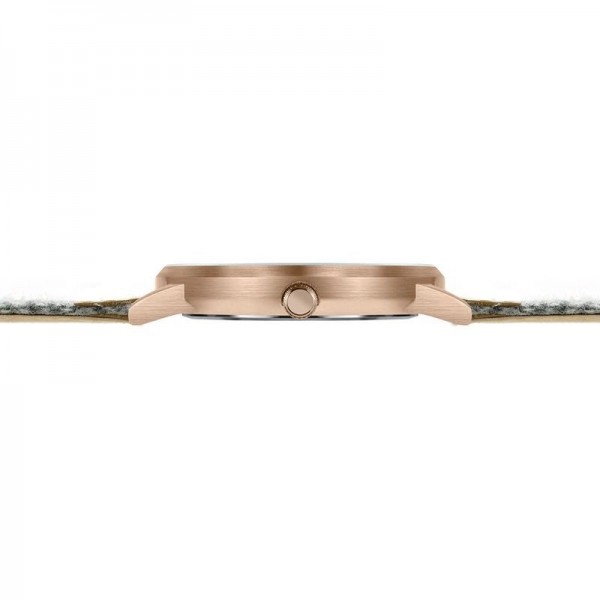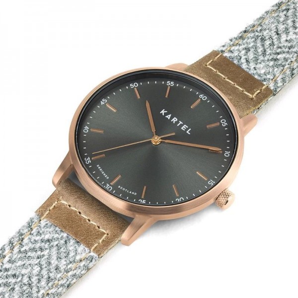 This KT-HUME 40mm-RGY model features a rose gold tone 40mm case with grey sunray dial on a pale grey herringbone pattern lambswool strap.